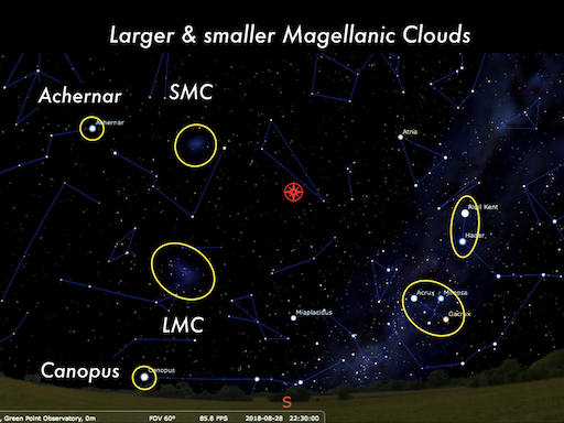 ★ Answer 1: Yes, you can see the LMC & the SMC galaxies without a telescope. Take a look at this image that shows you where to look. The LMC & SMC are some of our nearest intergalactic neighbours. The South Celestial Pole is marked with the red icon.